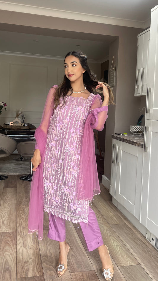 AMAL - Pink 3 Piece Heavy Embroidered Net Suit with 3D Detail