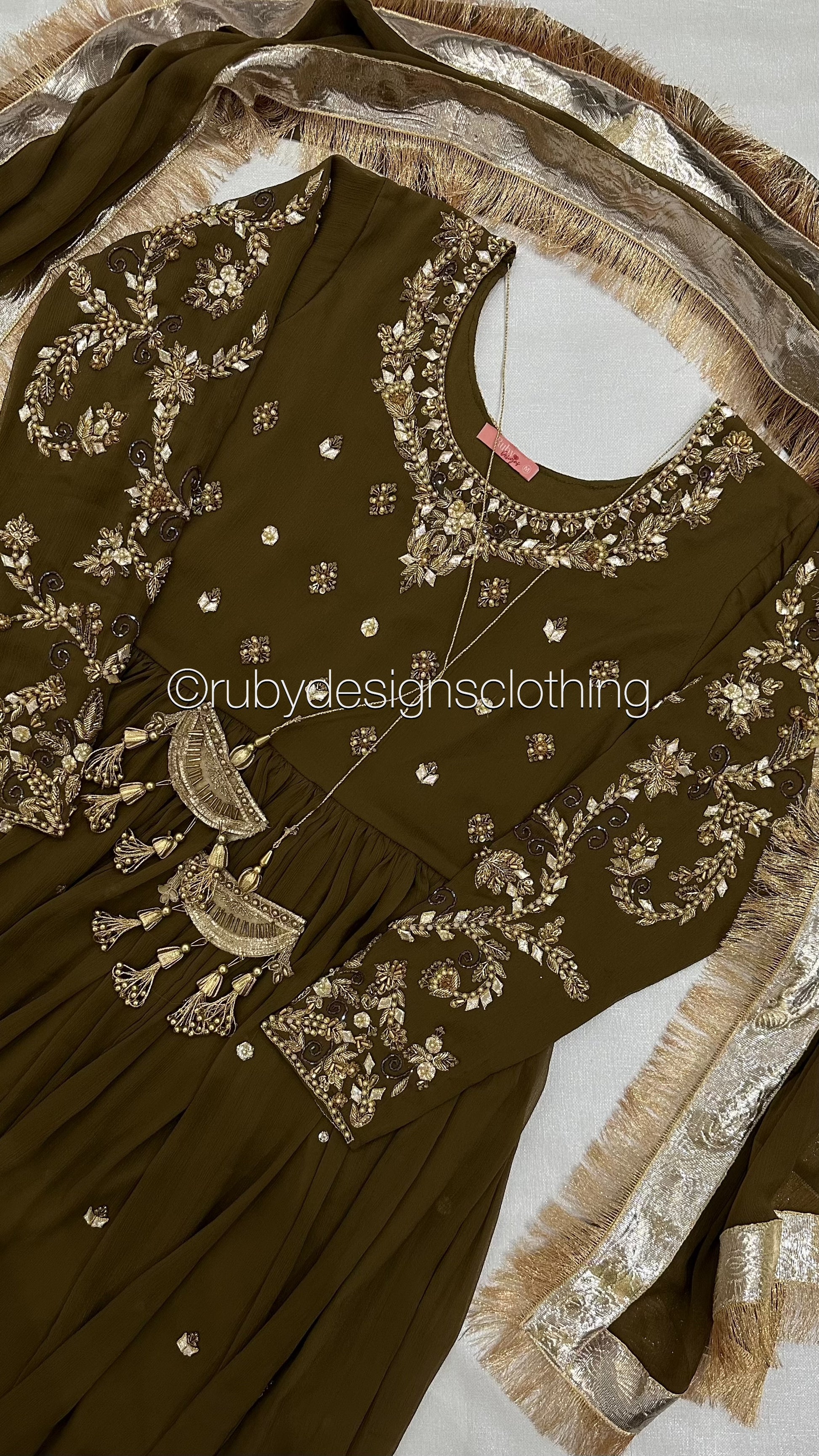 NAYRA Style 1 (Dress) - 3 Piece Khaki Chiffon Dress with Kiran Lace Dupatta and Churidaar Trousers