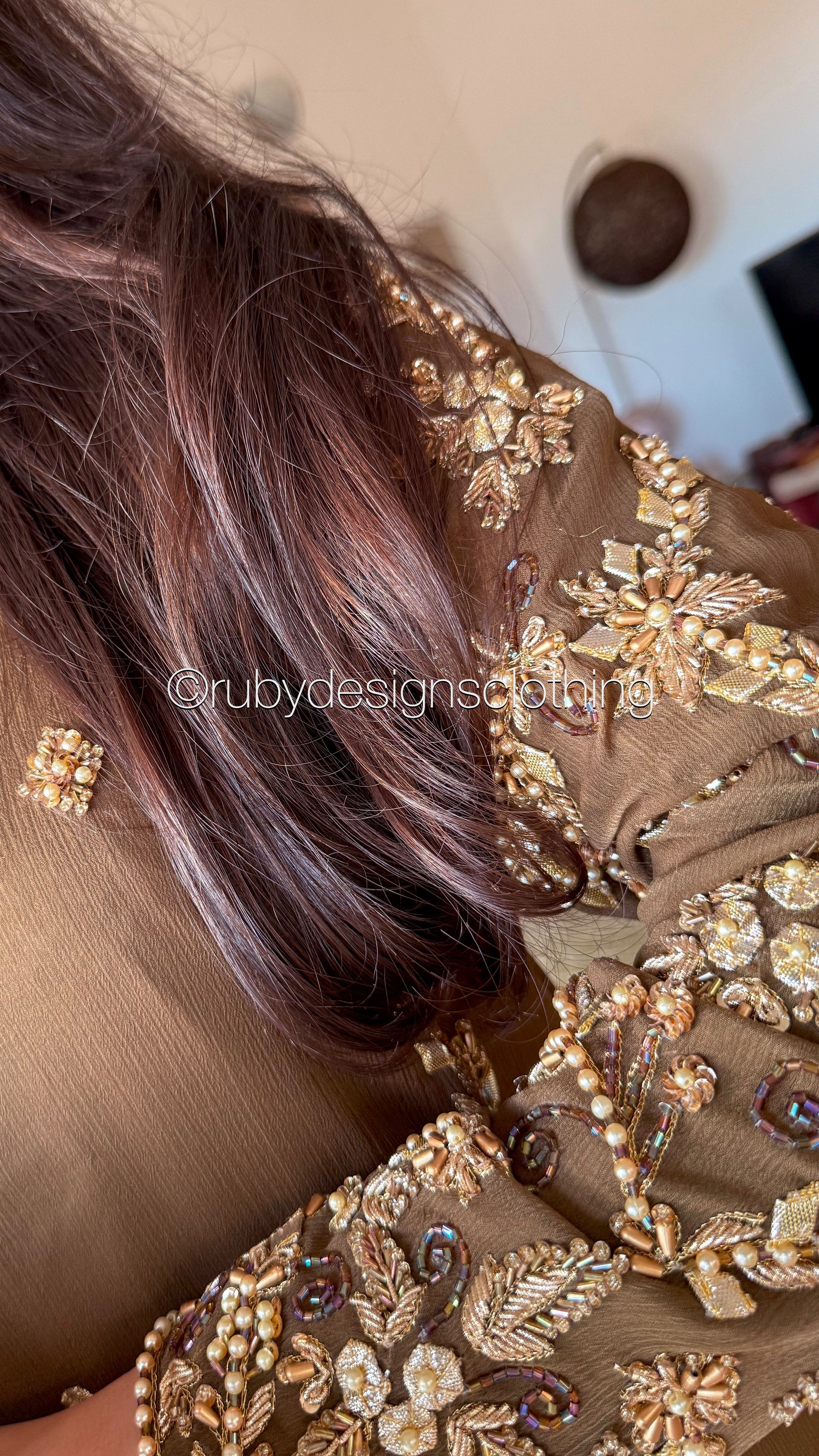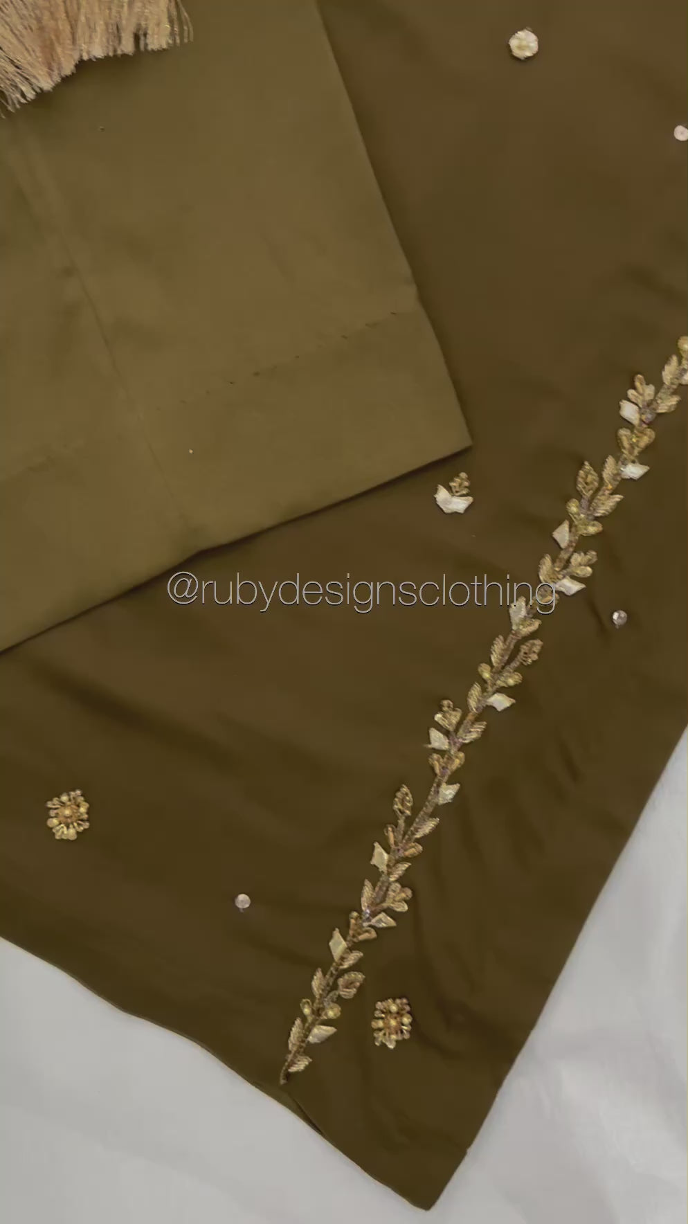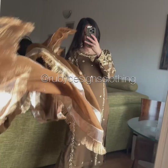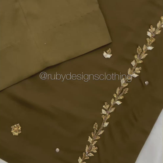 She’s sleek, she’s refined and unapologetically elegant. This is for the girls who love a clean silhouette with just the right amount of detail. The long kameez gives that graceful length, while the wide-leg trousers keep it classy and comfortable. The handwork is the star - intricate, warm, golden tones that elevate the entire look.