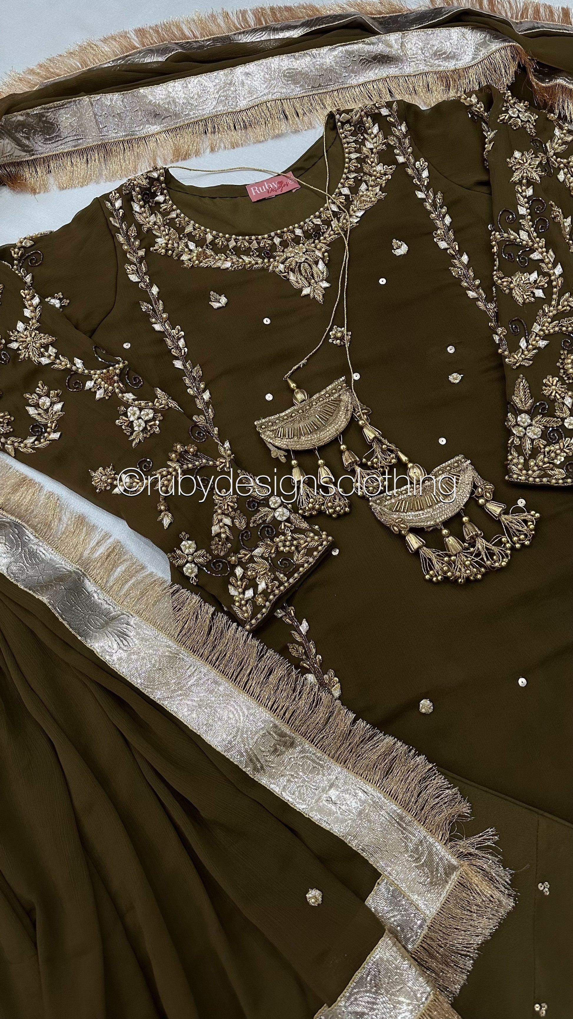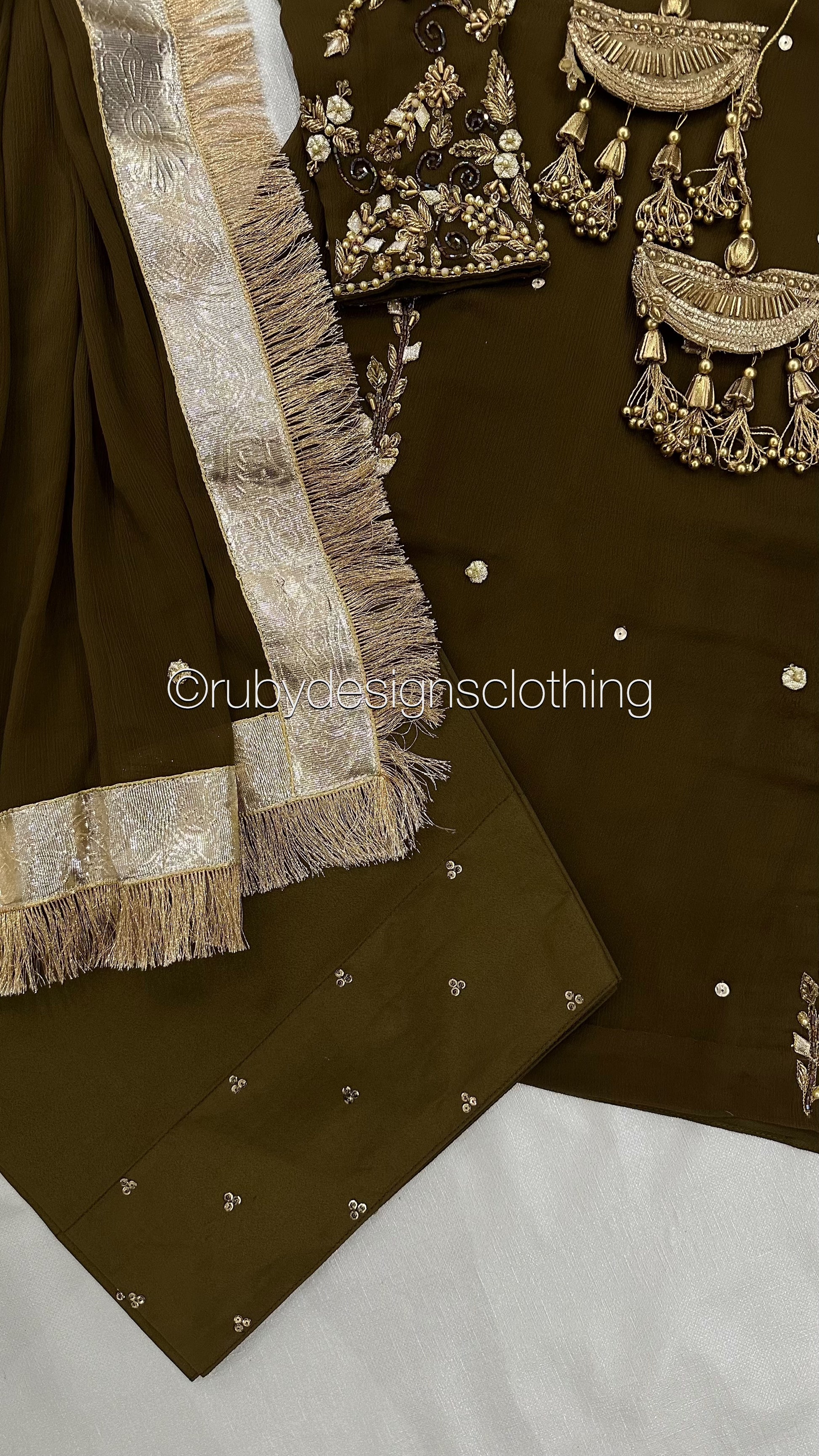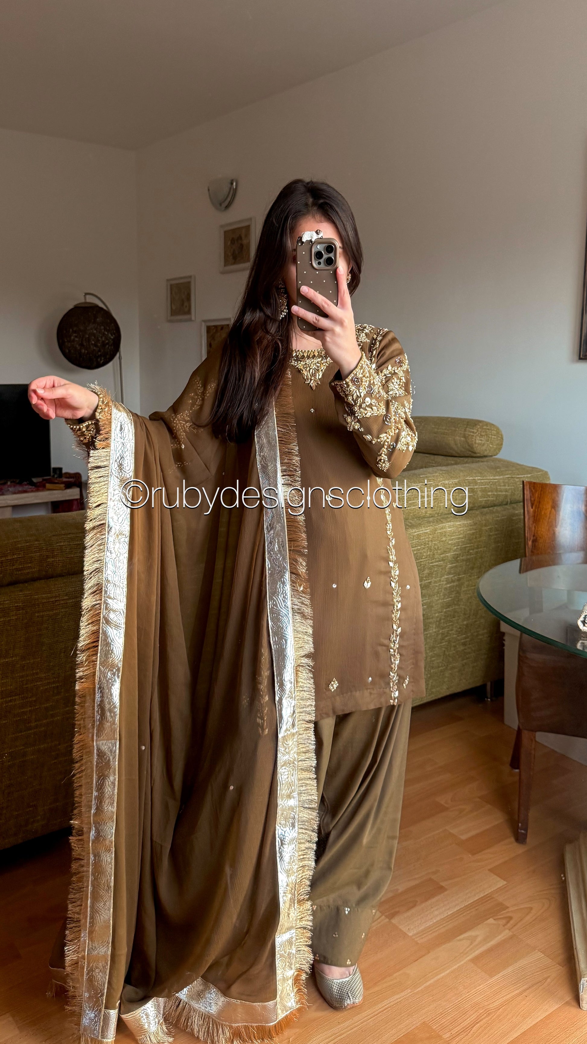 NAYRA Style 3 (Short Shirt) - 3 Piece Khaki Chiffon Suit with Shalwar