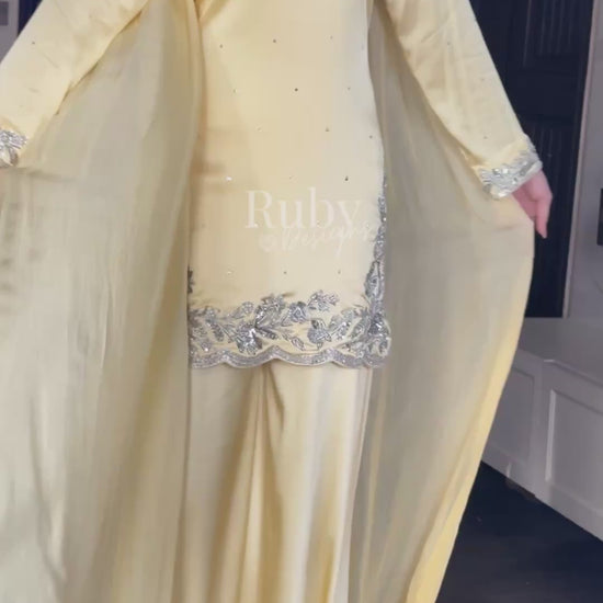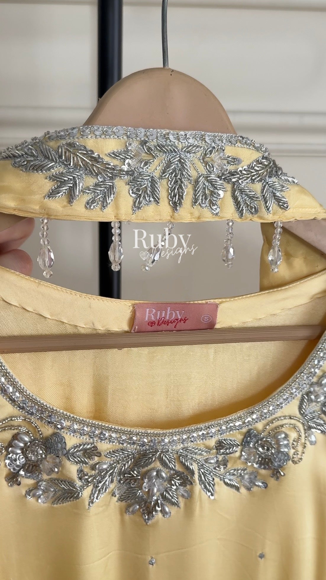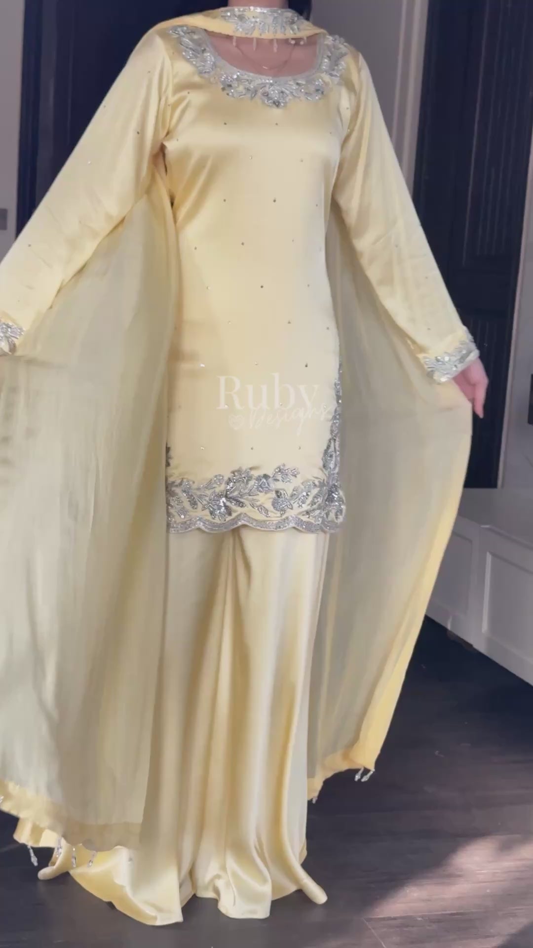 Our butter yellow moment for Eid. Soft, silky and effortlessly feminine. PARISA features delicate silver hand embellishment across the neckline, sleeves and hem, with subtle scattered sparkle throughout. She's paired with a flowy sharara that moves beautifully, and finished with our choker chiffon dupatta, this time with the prettiest tassel details. Elegant, flattering and perfect for Eid, wedding events and special occasions.