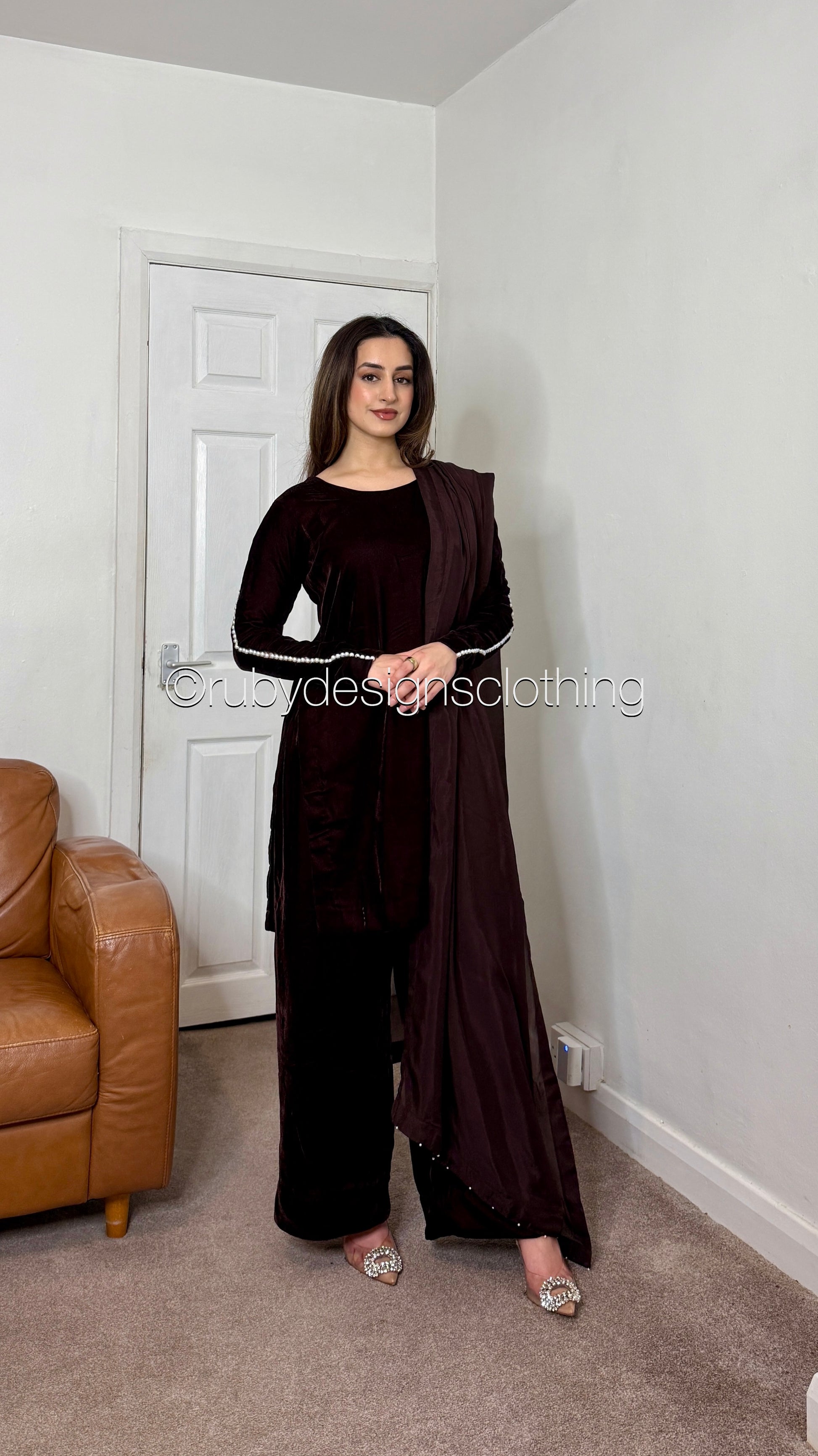 ADILA - 3 Piece Deep Brown Luxury Velvet Suit with Pearls