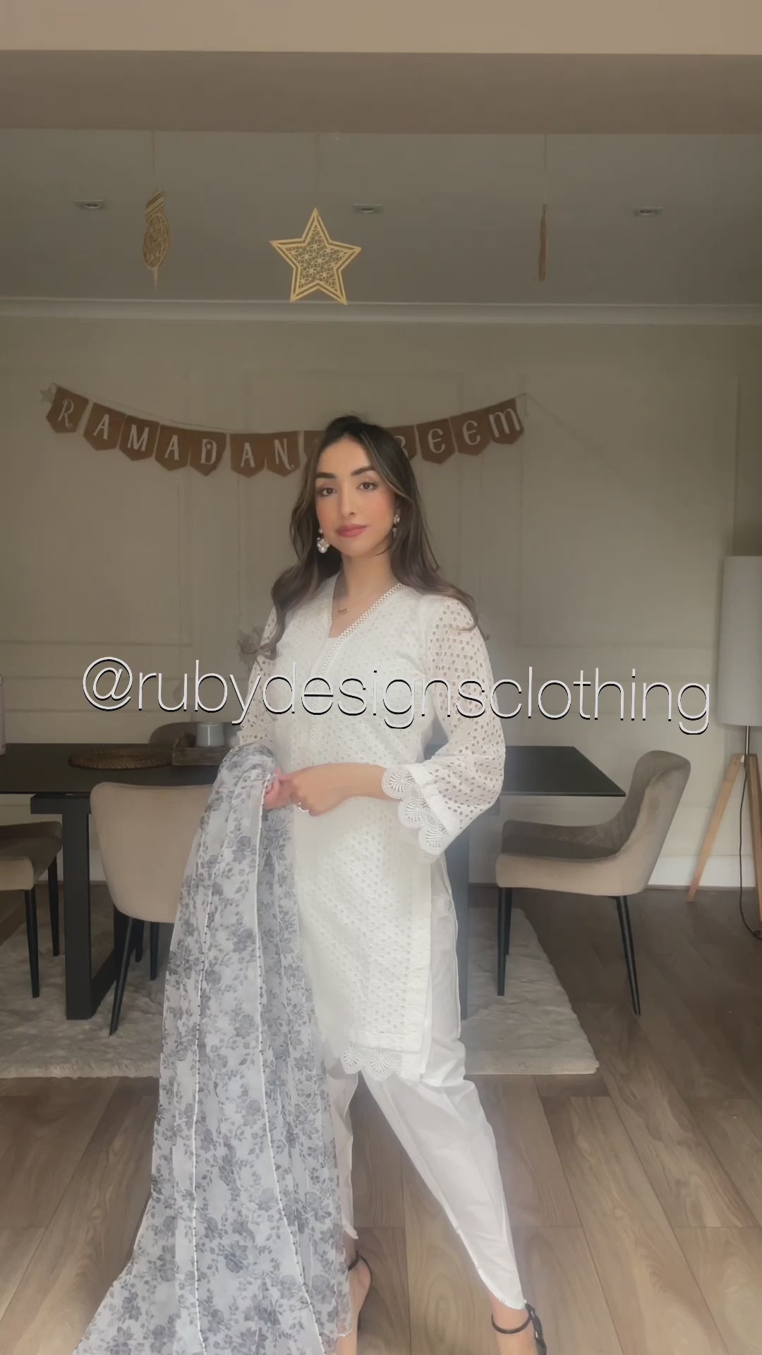 MAHEEN - your timeless classic with a twist! Embrace elegance in white with our RD chikankari suit paired with tulip trousers and a white and black floral organza dupatta. With a V-neck style and flared sleeves, MAHEEN radiates sophistication and charm. Plus, you can choose from three dupattas - organza, plain white chiffon, or floral print chiffon - to suit your mood and style. She’s perfect for your Eid celebrations this year!
