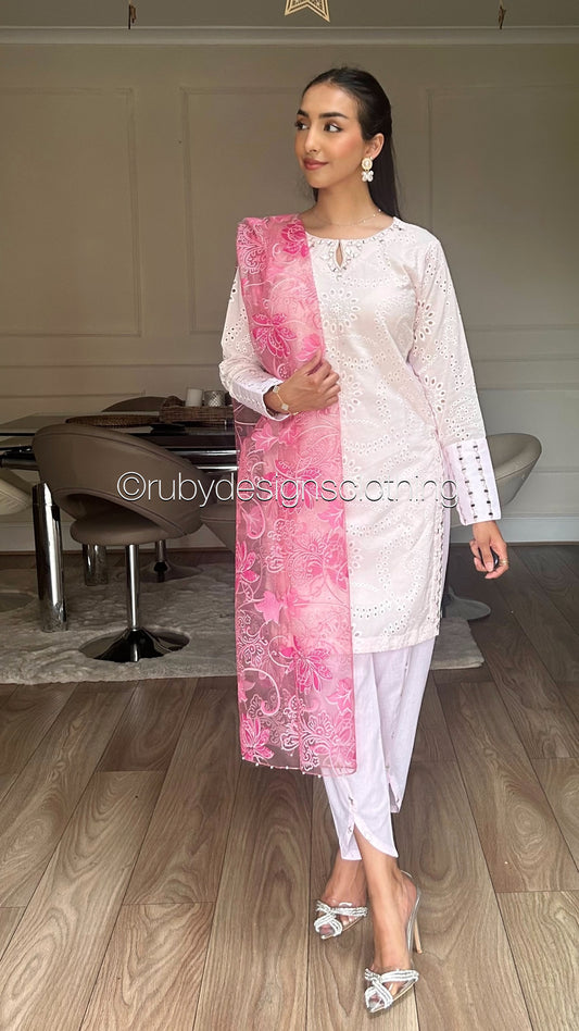 AZRA Pink - 3 Piece Pink Chikankari Suit with Floral Print Organza Dupatta
