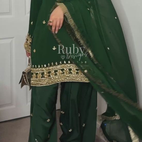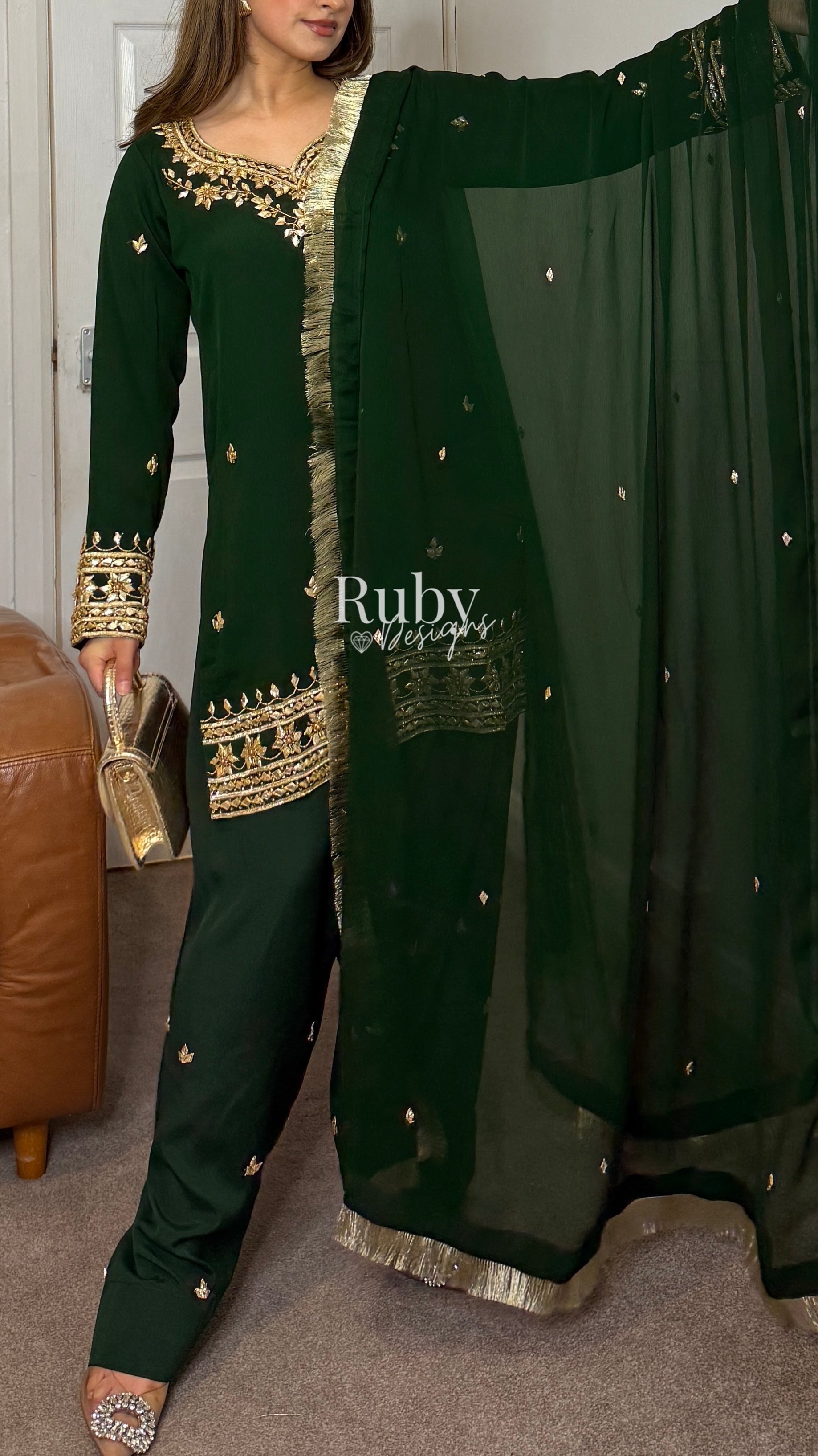 Say hello to SAJAL Emerald! š A jewel-toned beauty with traditional gota kaam and kiran lace, she's bold, striking and perfect for the current wedding season. Sheās for theĀ nights when you want to stand out without saying a word - the outfit does allĀ the talking. Wear her with statement earrings and a sleek bun for the ultimate luxe look āØ