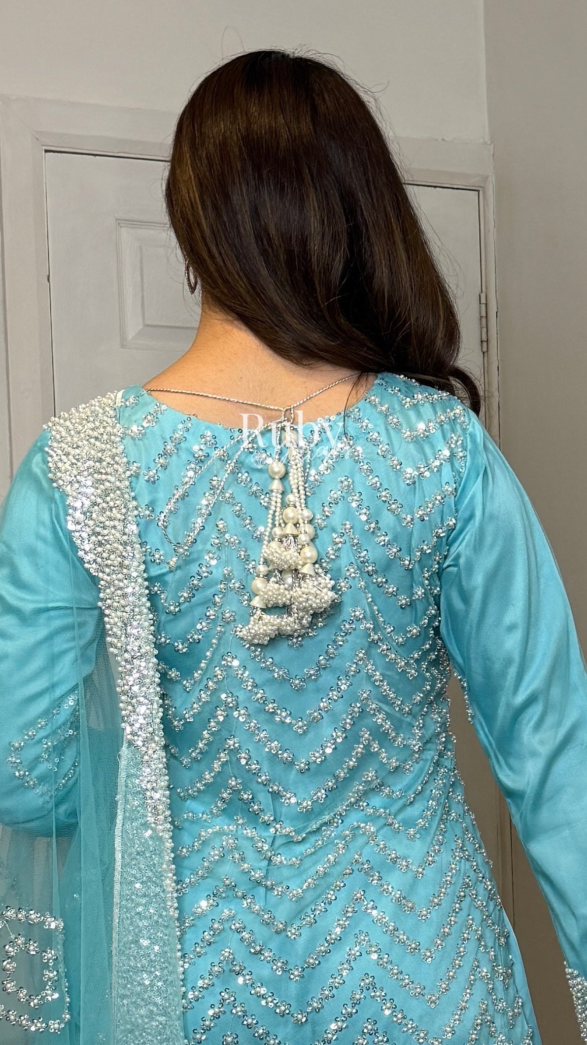 Cool, calm and dripping in sparkly elegance! IZMA is for the girls who love a glam moment. She’s got that effortlessly dreamy vibe - pastel aqua net with delicate shimmer, embroidery that twinkles in the sunlight, pearls for that luxe touch, and a fit that flows like magic. Perfect for Eid, garden dholkis, or any event where you want to look expensive without saying a word. She’s floaty, flawless, fully stitched and ready to wear with sleeve lining and fully embroidered front and back. Get yours and shine at your next event.