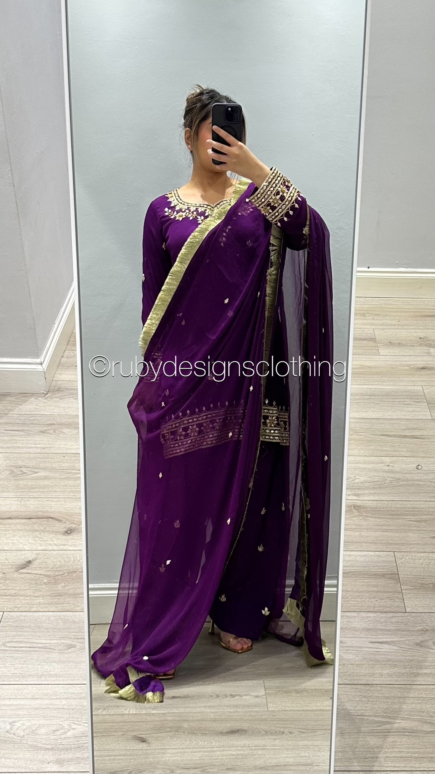 Say hello to SAJAL Purple - she’s for the girl who loves an exclusive piece! 💜 A deep, rich purple that screams understated glam, finished with intricate gold gota work and kiran lace. She's versatile enough to take you from a day dholki straight into an evening reception, and timeless enough to stay in your wardrobe forever, If you've been waiting for a farshi that feels chic, easy to wear and nobody else will have, SAJAL Purple is the one, because she’s super limited!